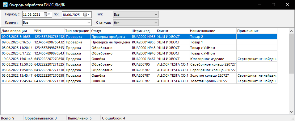 • «Повторить проверку» - отправляет на повторную проверку выбранную запись с УИНом, используется в случае если проверка УИНа в ДМДК не завершилась успешно.